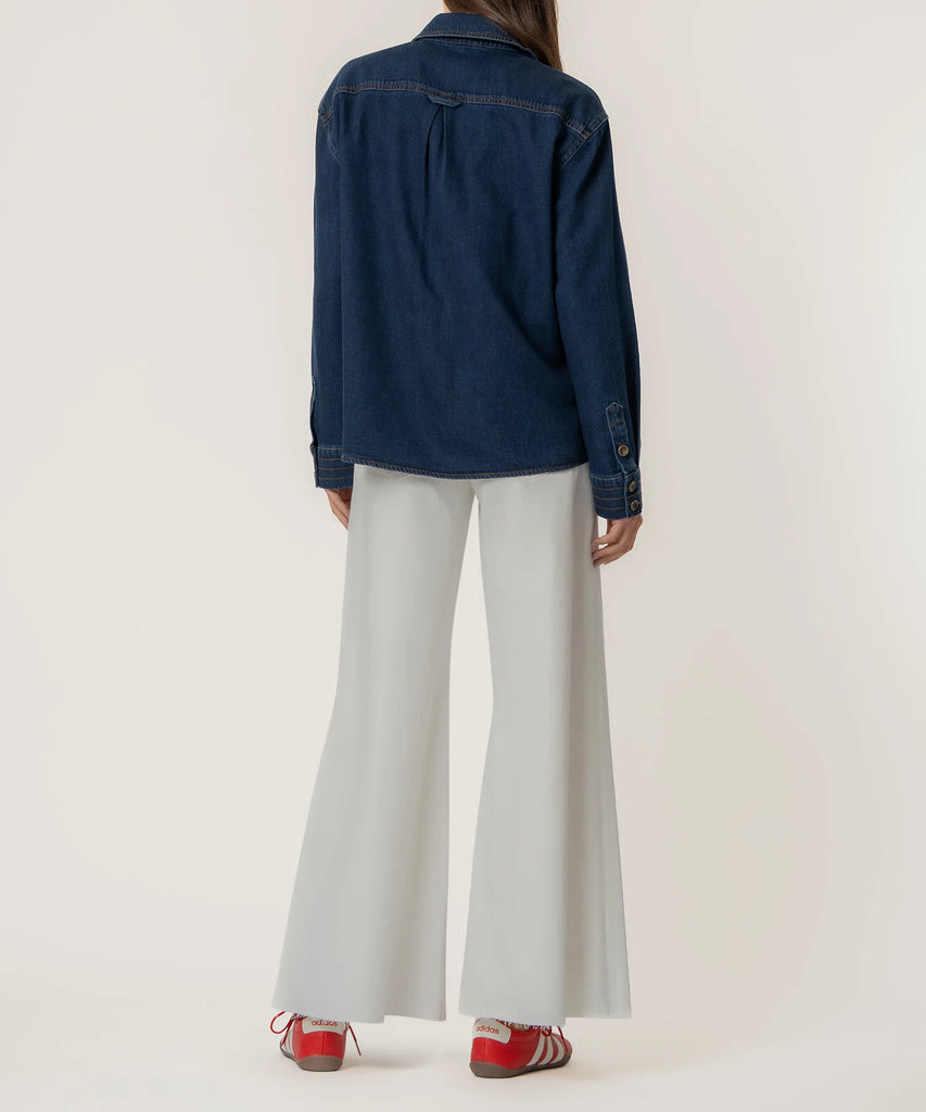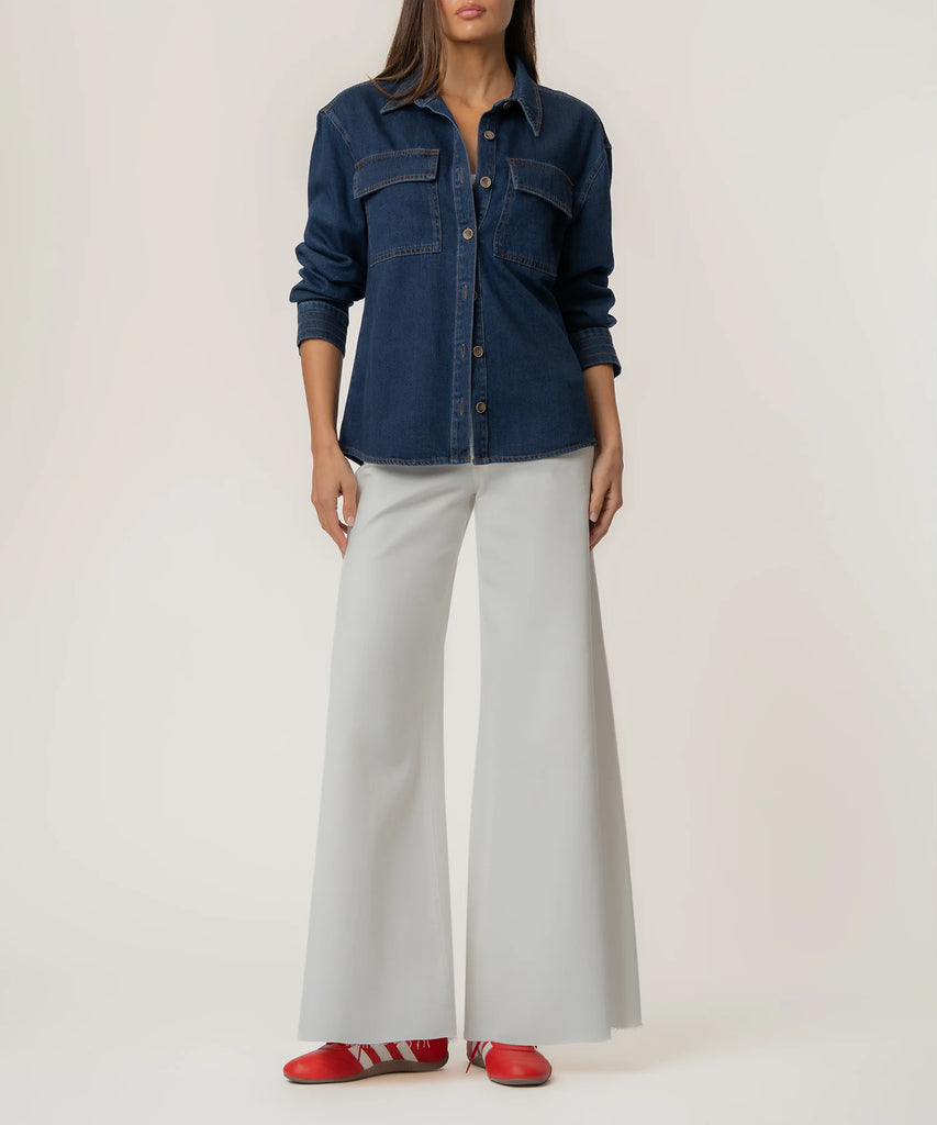 - Elevate your everyday style with this dark wash button front shirt, featuring long sleeves and subtle contrast thread detailing for a modern touch. Designed with practical pockets with flap closures, it combines clean lines with everyday functionality. Perfect for dressing up or down, it\'s a versatile piece for any wardrobe.