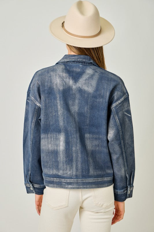 Metallic Washed Denim Jacket Collared Long sleeves Front zipper closure Front bottom buttoned pockets -Model is wearing Grey/Pearl with 61252 dress / 61236 top, Denim Blue/Pearl with 61274 top -68% Cotton, 30% Polyester, 2% Spandex -Model wears: S / Model height: 5' 9"