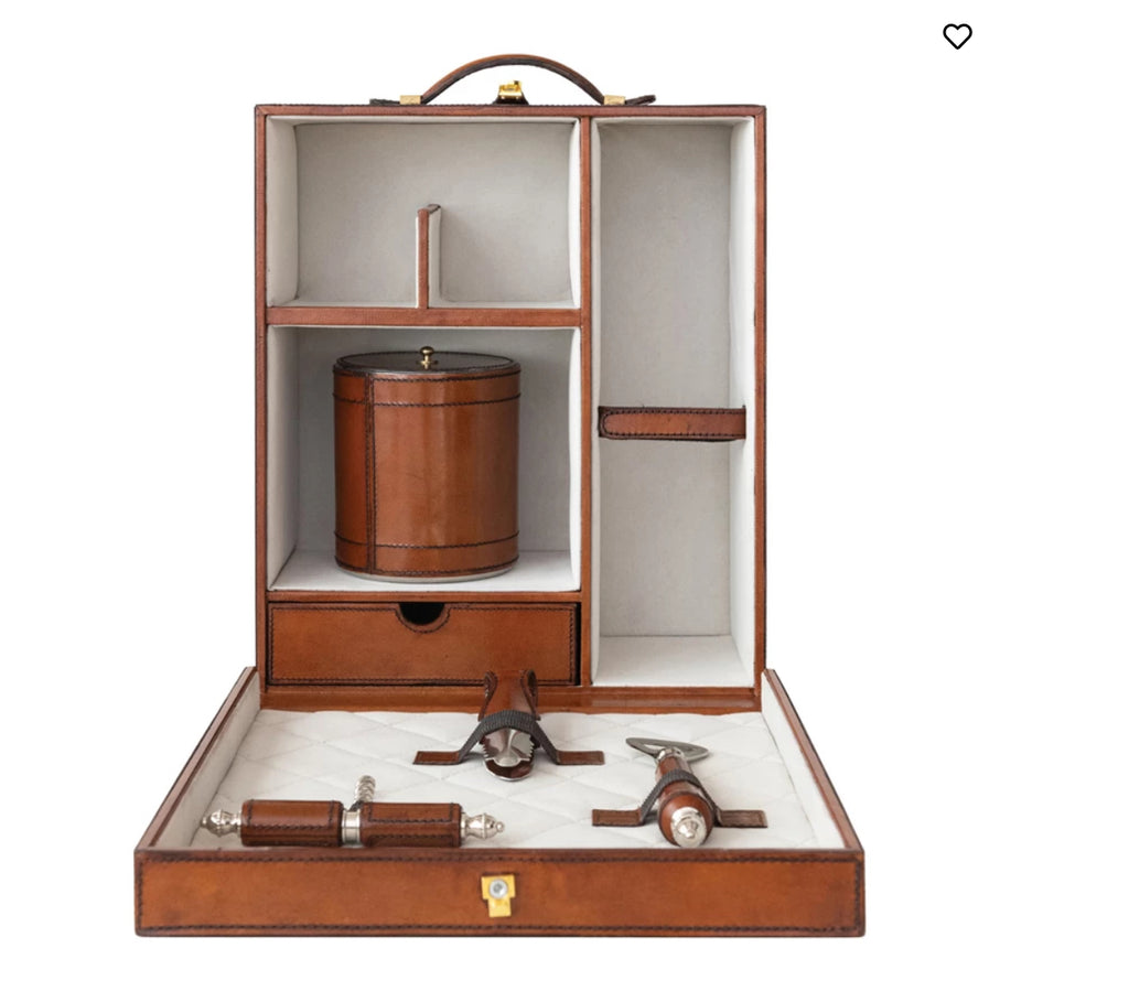 12"L x 7"W x 14"H MDF & Leather Travel Bar Trunk w/ Flocked Interior, 30 oz. Stainless Steel Ice Bucket, Bottle Opener, Cork Screw, Tongs, 5 Compartments, Magnetic Closure, Handle & Brass Hardware, Cognac & Cream Color, Set of 5
