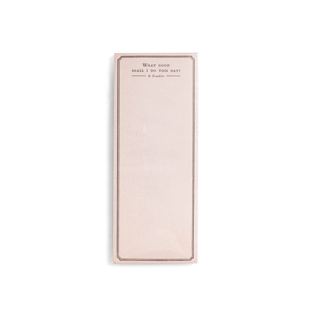 This unlined notepad will remind you, "What good shall I do this day?" - B. Franklin. Pages can easily be torn off and stuck to a fridge or tucked into a notebook or planner.