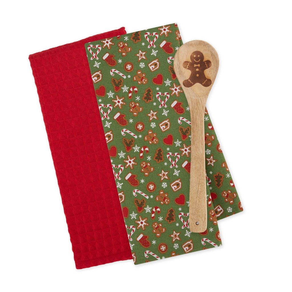 The Gingerbread Man Kitchen Gift Set includes a wooden spoon, two rolled dishtowels and a stainless steel cookie cutter.